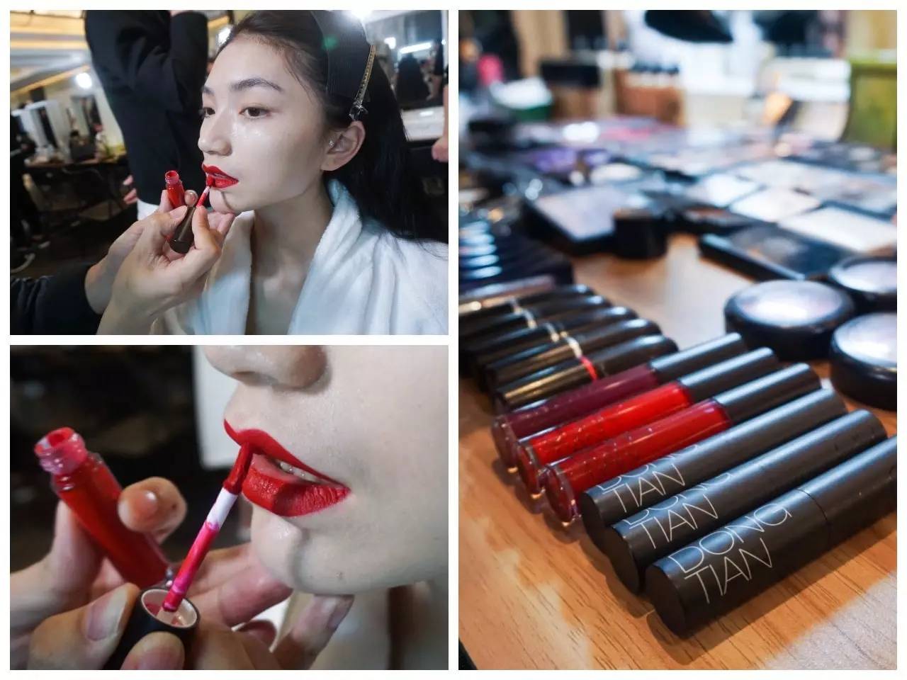 唇妆更是大有文章,用21号和26号东田奇幻唇釉和2号、3号东田奇幻唇膏诠释年轻的性感。21号唇釉大红色铺底,26号唇釉暗红色点染,像花瓣一样性感,每个嘴唇用 2-3种颜色打造亲吻式的唇妆,展现出一种亲吻之后嘴唇斑驳的效果,这是何等的浪漫。