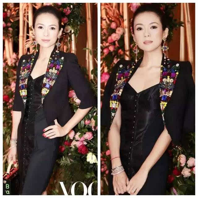 章子怡受邀出席杜嘉班纳 Alta Moda 及 Alta Sartoria 男女装高级定制系列北京大秀。黑色裙装搭配镶嵌华丽宝石的西服外套与闪闪的耳坠相映生辉,手上拎着2017春夏系列Dolce Box也别致有趣。