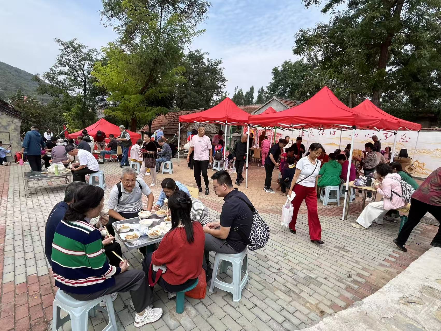 10月1日一早,车南峪村村东小广场就热闹起来,直径一米多的大铁锅早已架好,柴火在灶膛里“噼啪”作响,火苗窜得老高。切肉、洗菜、炸古扎(当地特色吃法)、炸豆腐,锅碗瓢盆作响,一派农村办公事的热闹景象。